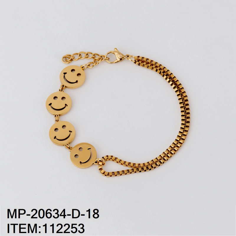 Vista rápida -50% -50% $117.60 $235.20 Talla 6 7 8 Pulsera Dama con Dijes Carita Feliz de Acero Dorado Inoxidable 18CM